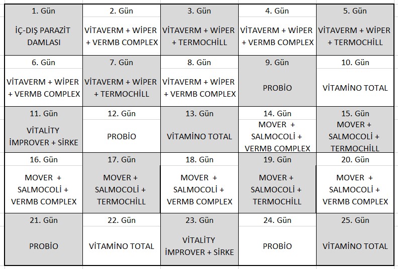Hasta tavuğa – TİTANİUM + MOVER ve/veya SALMOCOLİ uygulanabilir.